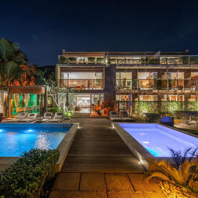 As acomodações são um convite ao descanso, decoradas em tons claros e adornadas com arte moderna, transmitindo um ar de leveza. O hotel ainda disponibiliza serviços como menus saudáveis e WiFi gratuito, além de estar a poucos minutos de atrações locais como o Clube Noturno Galeão e a belíssima Praia de Maresias.